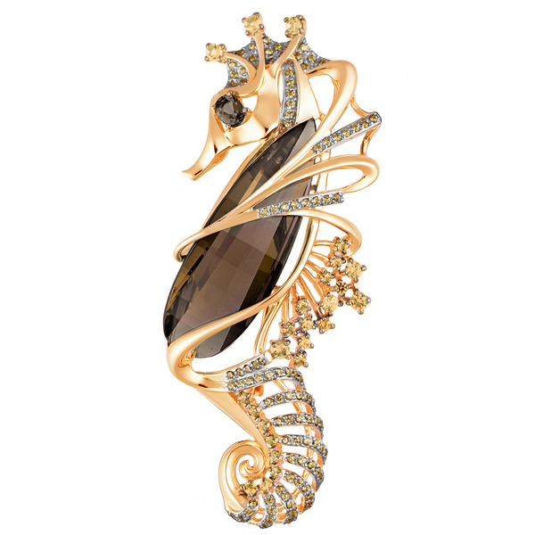 Брошь в форме морского конька — редкое и запоминающееся украшение, полное загадочной глубины. Основной акцент — раух-топаз огранки «груша», чьё дымчатое сияние подчёркивает изогнутый силуэт. Всё изделие усыпано камнями в тон — мягкими, мерцающими, словно отблески подводного света. Каждый изгиб, каждая линия словно вдохновлены движением моря и его тишиной. Украшение, которое притягивает взгляд своей необычностью и тонким благородством.