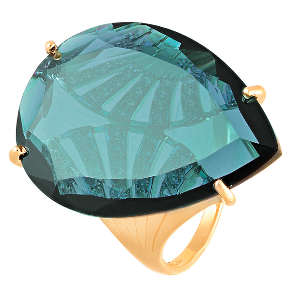 Кольцо с ситал лондон словно фрагмент подводного пейзажа, заключённый в металл. Почти полностью скрытая под волной цвета глубокого океана шинка создаёт иллюзию, что камень парит на коже. Полупрозрачный топаз огранки «груша» играет оттенками бирюзы и лазури, а под его гладью проступает силуэт пальмовых лепестков, усыпанных сияющими фианитами — как свет, преломляющийся на морском дне. Чистая ювелирная поэзия с тропическим акцентом.