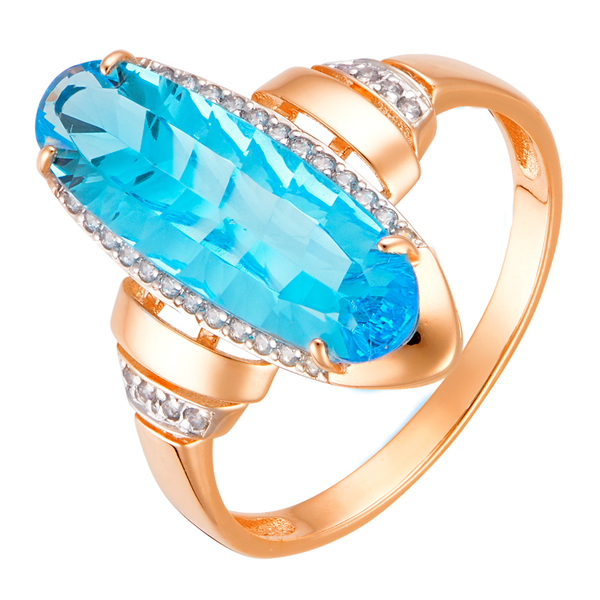 Элегантное кольцо из красного золота с большим ситалом топаз овальной огранки. Топаз, словно капля океана, притягивает взгляд своей чистотой и прозрачностью. Рассыпанные мелкие фианиты вокруг камней создают эффект ореола, усиливая его сияние. Тонкая шинка позволяет акцентировать внимание на красоте камня. Это кольцо станет прекрасным дополнением к вечернему выступлению. Сочетайте его с платьями из шелка или шифона, струящимися по фигуре. Для делового образа можно надеть его с костюмом в светлых тонах, придающем образу роскоши и изысканности.