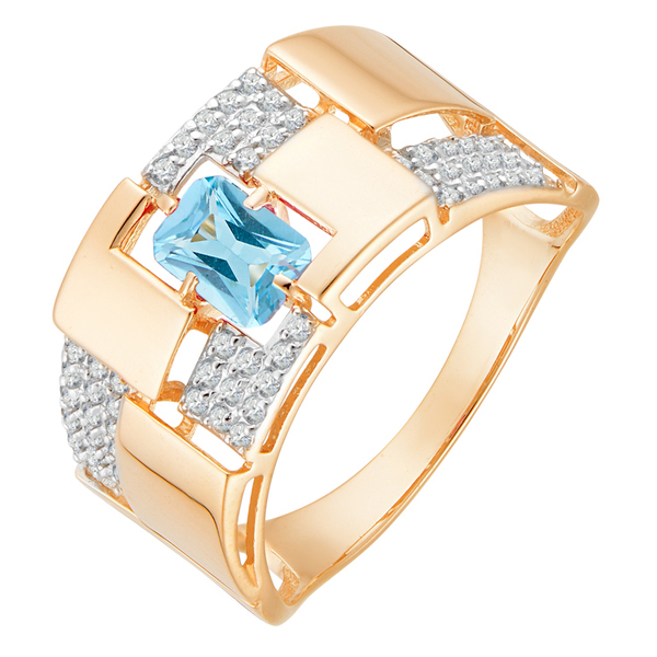 Массивное кольцо, выполненное из благородного красного золота, представляет собой современную интерпретацию классики. Топаз свис в огранке «багет» в центре, окруженный сверкающими фианитами, создает геометрический, четкий и притягивающий взгляд дизайн. Ступенчый вид и широкая шинка подчеркивают уверенность и силу характера. Это кольцо отлично подходит для создания делового образа. Сочетайте его с костюмом в нейтральных тонах, например, сером, бежевом или темно-синем. Также можете дополнить лук лаконичными часами.