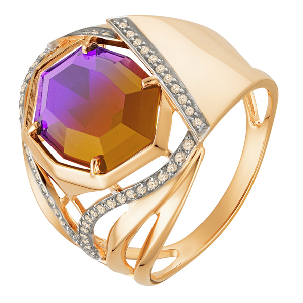 Изысканное золотое кольцо, в центре которого многогранный камень - синтетический аметрин, дополненный сияющей инкрустацией бежевыми фианитами. Плавные золотые линии обвивают камень, создавая эффект движения и лёгкости. Эффектное и женственное кольцо для тех, кто любит нестандартную роскошь.