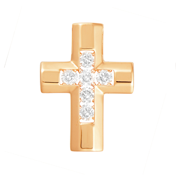 Золотой крест строгой геометрии с акцентом в самом центре — композиция из бриллиантов, выложенных чётким перекрестием. Блеск камней подчёркивает симметрию и силу формы, создавая ощущение уверенности и ясности в каждой детали. Сдержанное, но эффектное украшение с характером.