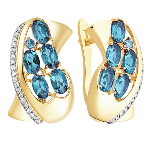 Серьги в стиле модерн из желтого (лимонного) золота приковывает взгляд благодаря зеркально отполированной, немного выпуклой поверхности и выглядит как тщательно продуманная композиция света и формы. Лондон топазы, расположенные четко по рядам, придают изделию статусность и строгость. Белые фианиты придают блеска и сияющего, уместного дополнения ко всей композиции. Серьги не нуждаются в сопровождении других изделий и точно не останутся незамеченными.